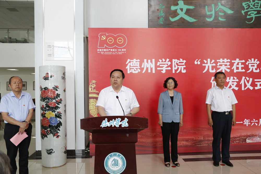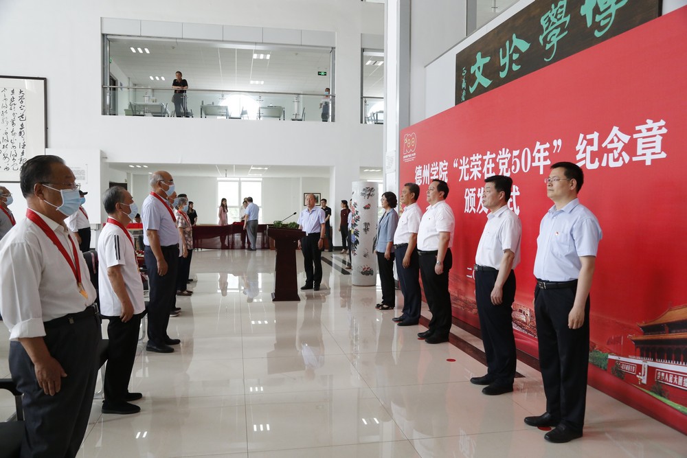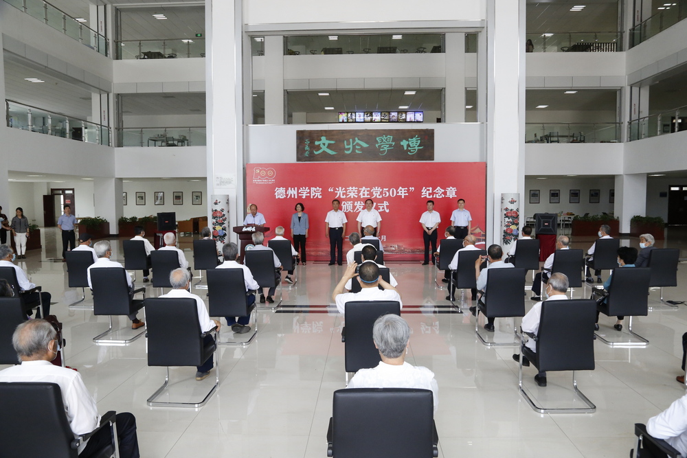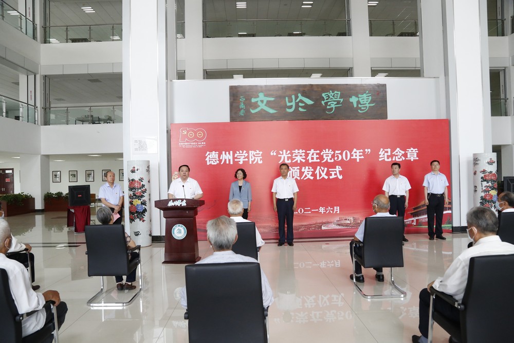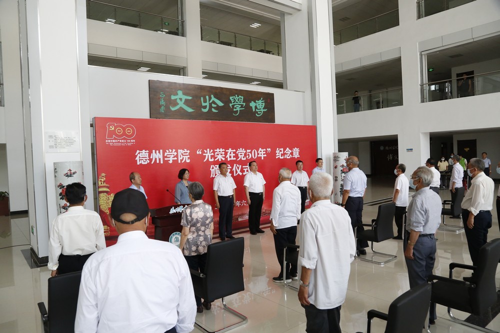 6月17日下午,在中国共产党百年华诞即将到来之际,学校在博文楼一楼大厅举行“光荣在党50年”纪念章颁发仪式。校党委书记车滨出席仪式并讲话,党委副书记王金利,党委委员、副校长张明征,党委委员、纪委书记、省监委驻德州学院监察专员刘继泉,党委委员、组织部部长、统战部部长杨恩红,党委委员、宣传部(教师工作部)部长任立春出席。38名“光荣在党50年”纪念章获得者代表参加仪式。仪式由王金利主持。