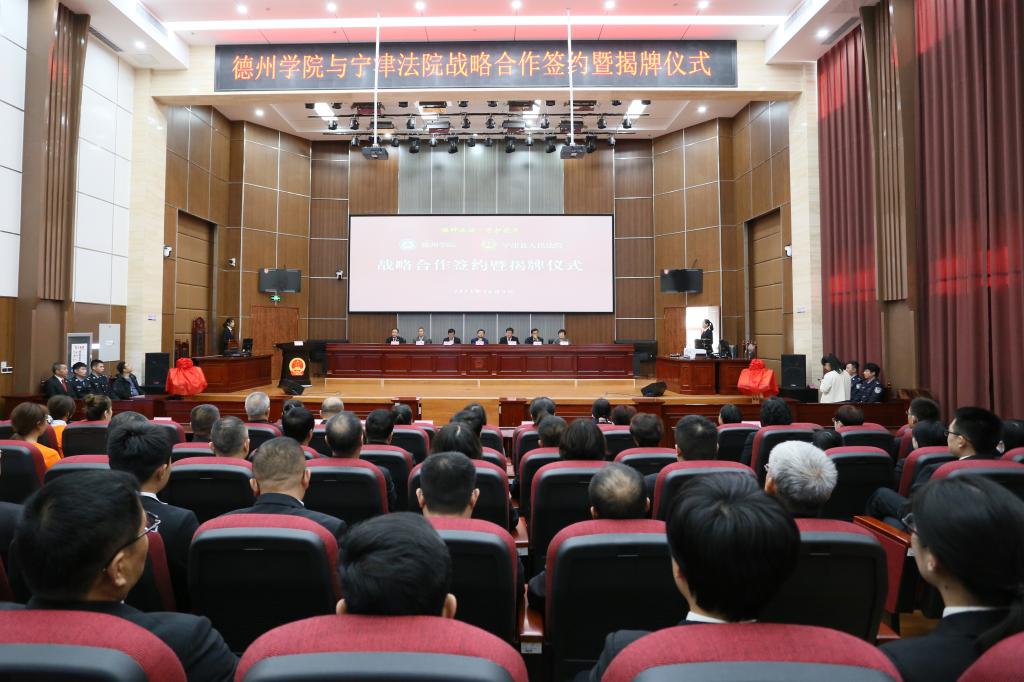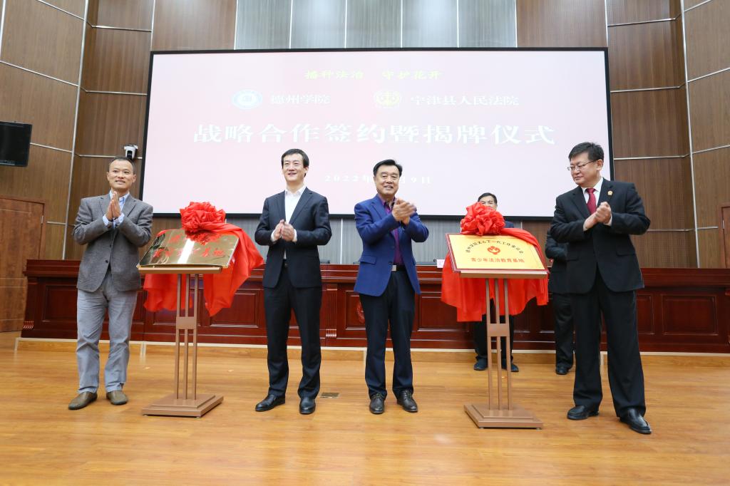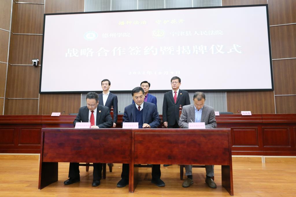 仪式上,“德州学院实习实训基地”“德州学院青少年法治教育基地”基地揭牌,双方共同签订共建战略合作协议书。学校向宁津县人民法院赠送《德州学院史》《德州地域文化研究丛书(精选版)》《我国专门法院(庭)设置的基础研究与前瞻》《黄河三角洲生态经济法治建设研究》等校本著作。